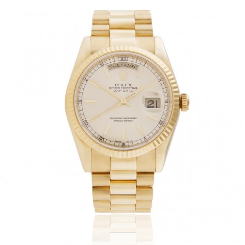 The benchmark of success, the Presidential Rolex has always been a symbol of status. Made of solid 18k Yellow Gold this Rolex Day-Date features a 36mm 18K yellow gold case, fluted bezel, silver dial, index hour markers, and President bracelet.