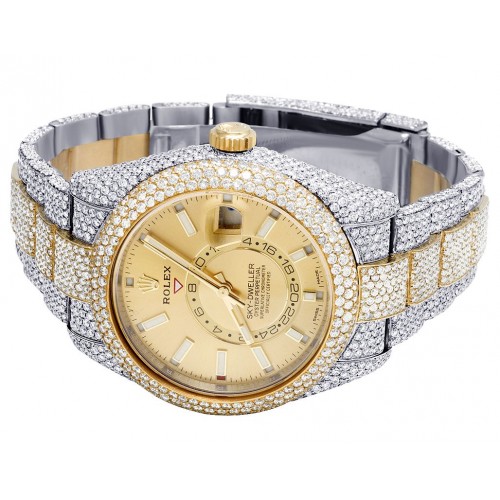 This Brand new Rolex Sky Dweller model 326933 features 31.5 Ct of hand-picked genuine diamonds masterfully set. The diamond bezel features diamonds set in a honey comb setting set directly on the original Rolex bezel. The diamonds continue throught the side the case and on the entire band. Diamonds are set in a flawless "honey comb" setting with less than 1mm gap between each stone. This setting utilizes the most amount of diamonds possible to set in on a watch. There is absolutely no metal even visible with this type of diamonds setting. Consists of an original champagne dial with stick markers. A true work of art displayed on this time piece. Takes 3-5 months to customize this these type of watches.
