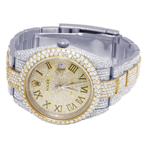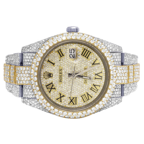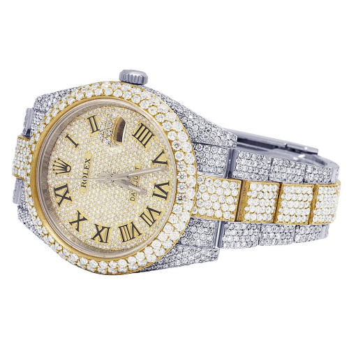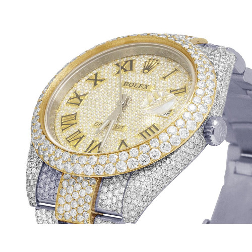 This authentic New and customized Rolex Datejust II features over 28.55 carats of hand-picked genuine diamonds masterfully set. Diamonds are set on an aftermarket yellow gold bezel in two rows in a honeycomb setting. Stainless Steel case and Yellow Gold/ Stainless Steel bracelet. The watch features flooded diamonds all over set in a honeycomb setting without borders. It consists of a honeycomb pave diamond dial with roman markers. Diamonds are set flawlessly throughout on this timepiece on the dial, band, side case, side links, and buckle.
