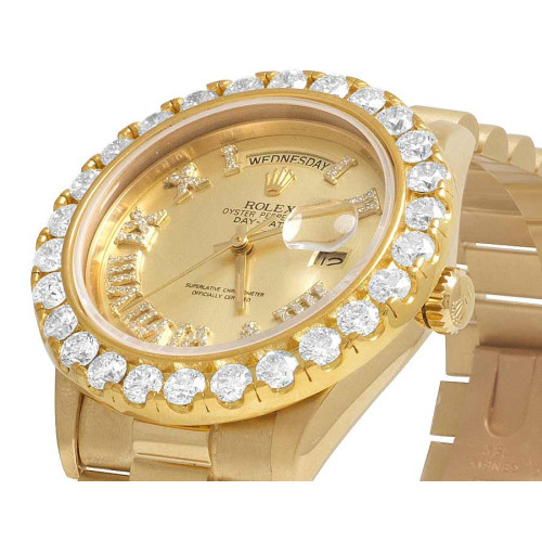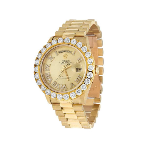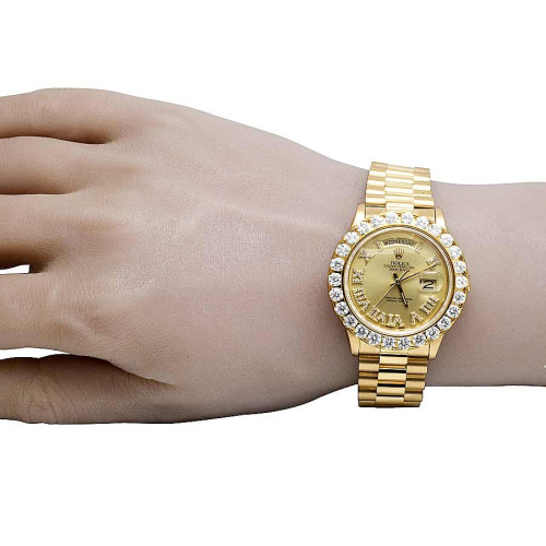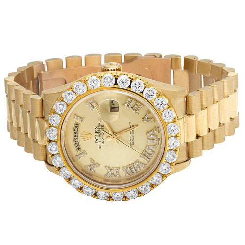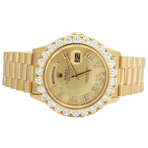 This is a 100% Genuine Rolex 18K Yellow gold President Day-Date Watch with 6.7 Carats Genuine Diamonds custom added to the Bezel & 0.50 Ct on the Champagne Roman Number Dial. THIS IS THE FULL SIZE DESIRED MODEL FOR MEN. This watch is in super excellent condition and looks Brand-New on the wrist. An excellent condition president model like this is hard to find and if it were brand new it would retail at almost $43,000. The original 18K Gold case is in excellent condition with no Dings, Dents or deep scratches. The Diameter is 40MM not counting the 18K original screw-down Rolex crown. The crystal has been replaced with a brand new sapphire crystal. The bezel is solid yellow gold and consists or beautiful VS2-SI1 clarity diamonds in a bead setting. Brand new 18K bracelet added to the watch (non rolex). Comes with full set of links and is 8.25 inches in circumference. Original Rolex case with original Rolex automatic movement with quick-set function for date. The movement has been recently serviced.