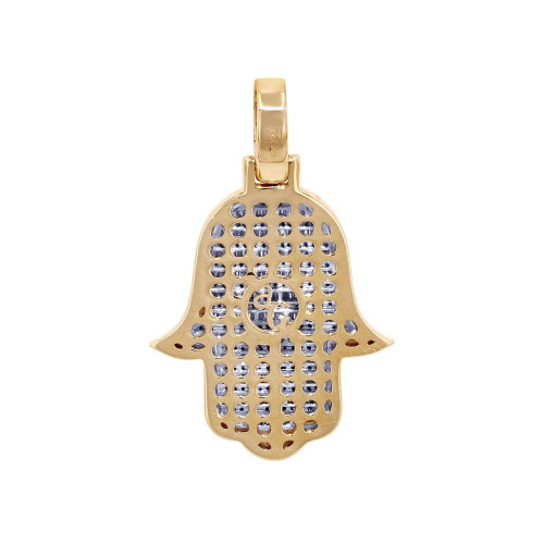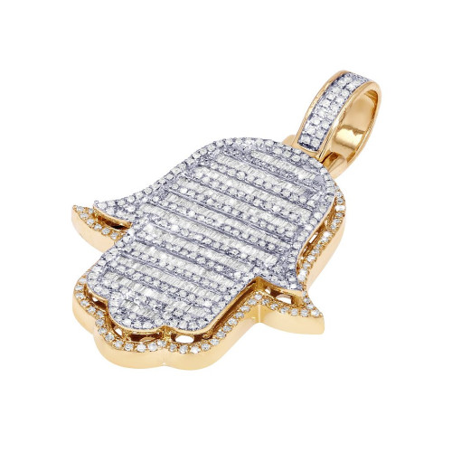 A thoughtful look with modern sparkle, this diamond Hamsa 3 dimensional pendant is certain to be treasured. Created in precious 14K Yellow/white gold, this charming choice features diamonds-lined hamsa hand adorned with a close arrangement of baguette diamonds, invisible set and round-cut diamonds, in prong set in alternate rows. Radiant with 1.75ct of diamonds and a bright polished shine. A stunning hamsa charm for protection and blessing crafted with VS2-SI1 clarity of H-I color, measuring 1.8" in length and 1.2" wide. Weighing 12.6 grams with a cage back.